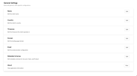 This feature will allow you to configure general and client specific details that appear throughout the platform like name, country, timezone, domain, email, metadata schemes, and about information.