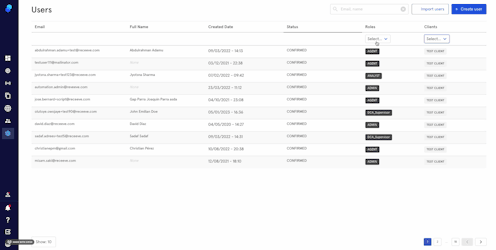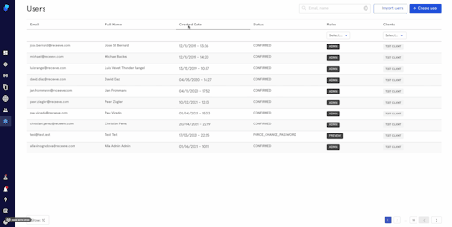 The User Management page displays information about the users: email address, full name, created date, status, role, and clients (meaning access to different instances).