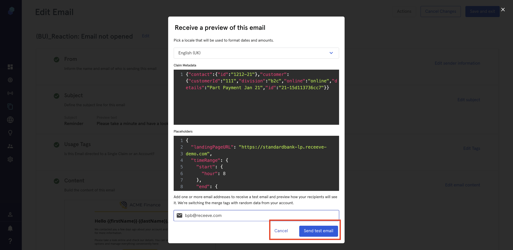 - JSON metadata: All the "standard" data is automatically filled in a random manner, such as name, amount, due date, etc. If you use some special metadata in the email, you might want to provide it so it appears in the test email.