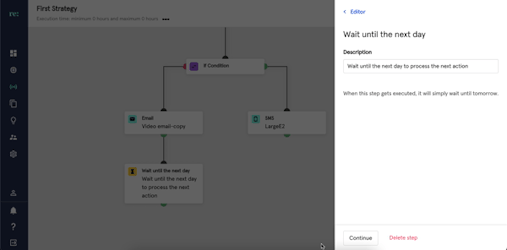 Then click continue to save the description. The next linked step will be executed after a day. In the example below, after the ‘Email’ step is executed, the strategy will proceed with the 'Wait until next day' step. By executing it, the strategy will stop and wait for a day before resuming with the next step attached which is ‘Place Call’.